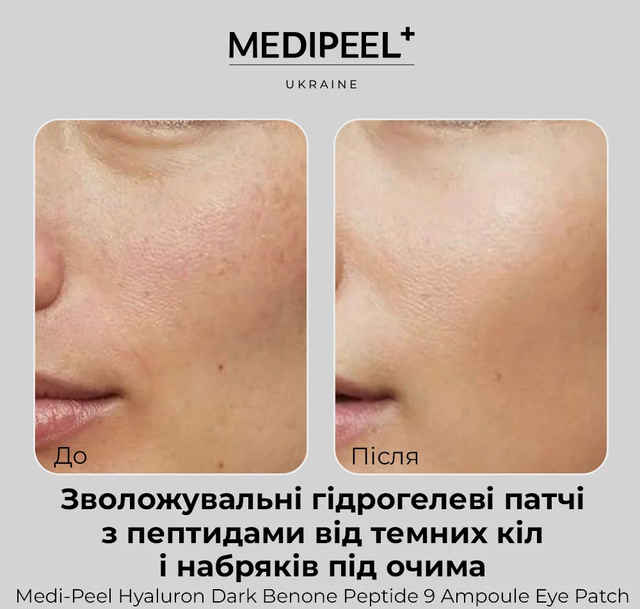 Medi-Peel Hyaluron Dark Benone Peptide 9 Ampoule Eye Patch - освітлювальні патчі для очей, збагачені пептидами, переймаються боротьбою з темними колами і набряками, делікатно освітлюють і освіжають шкіру навколо очей. Ці продукти забезпечують відбілювальний ефект і скорочують пігментацію шкіри. Крім того, пептидний комплекс стимулює оновлення клітин шкіри, зменшує зморшки і підтримує її молодість.
